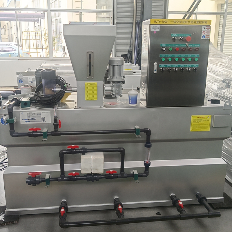 The jet-flew mixed is used in this device and the high-speed hydraulic disperses the chemicals or powder to increase the fineness and contact and penetration area between chemicals or powder and water and reduce the solution time. The equipment is the 3-tank overflow combination, namely, preparation and curing as well as batching. The gravity and solution automatically. The uniformity of solution is increased after agitation by low-speed agitator.