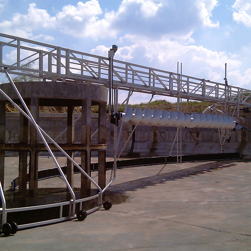 The drive unit drives the working bridge to rotate along the tank periphery and drives the scraping arm and sludge scraping plate to rotate simultaneously. The sludge is suctioned into the sludge cylinder after it is scraped and collected by sludge scraping plate. Afterwards, the sludge is discharged from the pool through the central sludge discharge pipe of the pool. The scum above the water surface is skimmed to the edge of the pool by a rotating slag skimmer, and then scraped out by the slag removal bucket.